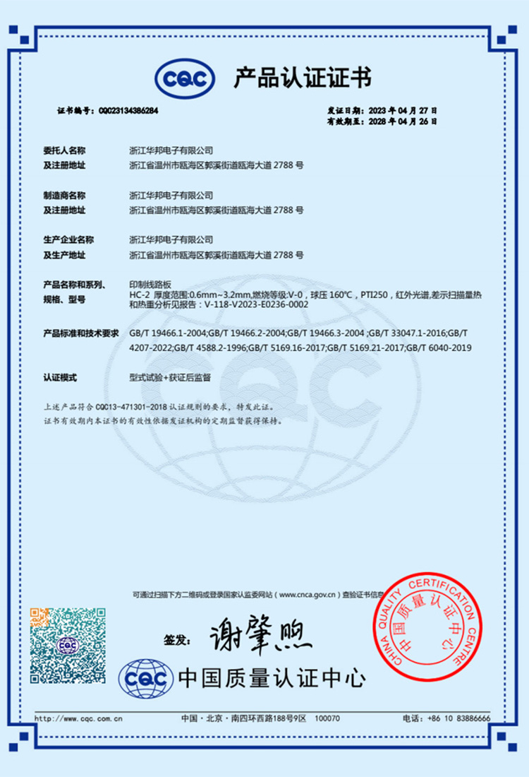 浙江華邦電子有限公司位于溫州市甌海經濟開發區C園區,成立于2001年2月,是一家專門從事單、雙面及多層印制線路板的生產企業。榮獲美國UL安全認證、IATF16949證書、科技型中小企業證書、新型技術企業證書(有效期至2024年12月16日)、CQC證書等。
